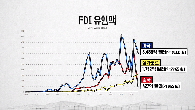 그럼 돈 측면에서는 어떠냐? 돈 측면에서 보면 FDI라고, '해외로부터의 직접 투자 유입액'입니다. 이 FDI 유입액이 전 세계에서 가장 많은 나라가 또 미국이에요. 1년에 한 3,500억 달러(약 510조 원) 정도 들어옵니다. 이 정도가 또 감이 안 오실 수 있어서, 세계에서 두 번째로 FDI 투자 유입액이 많은 나라가 싱가포르거든요. 이게 왜 그러냐면 싱가포르가 나라는 작은데 전에는 중국으로 가던 FDI 투자 유입액이 중국으로 바로 가는 게 이제 좀 걱정스러워지거나 부담스러워지니까 싱가포르를 우회로로 쓰거나, 요즘 싱가포르 경제가 뜨다 보니까 싱가포르로 들어오는 투자가 많아요. 그런데 이 싱가포르로 들어오는 FDI 투자액이 세계 2위인데 미국으로 들어오는 규모가 이곳의 2배입니다. 그러니까 1위가 2위의 두 배예요. 그만큼 많습니다.