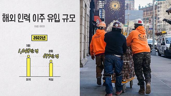 그래서 이게 어느 정도 숫자냐면 트럼프 1기 재임 시기 4년간 늘어났던 해외로부터의 인구 유입에 비해서 바이든 재임 시기, 코로나를 끼고 있죠. 그 4년 동안에 외국으로부터 들어온 순 인구 유입액의 증가 규모가 3.5배입니다. 3.5배. 공식적으로 확인된 합법적으로 미국으로 들어온 사람이 2022년 기준으로 1년 동안 천만 명이 넘습니다. 이게 어느 정도 규모냐면 당시 두 번째로 해외로부터의 순 인구 유입이 많은 나라가 독일이거든요. 근데 독일보다도 1.6배입니다.