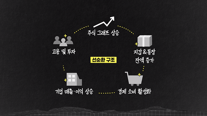 그러니까 한마디로 뭐냐 하면 오른 주가가 가계를 부유하게 만들고 소비를 늘리고 기업의 매출과 이익을 늘리고, 그게 고용과 투자를 늘리고 그것에 대한 기대로 다시 주가가 오르는 선순환 구조가 만들어질 수 있었다는 거죠. 그래서 사실은 돈이 많아지고 또 돈이 들어오니까 이런 효과를 누릴 수 있었던 겁니다.