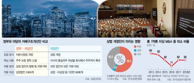 이처럼 주주가치 훼손 사례가 여전한 만큼 시장에 미치는 파급력이 큰 상법 개정안보다는 핀셋 규제 방식인 자본시장법 개정안이 합리적 대책이라는 평가다. 상법은 비상장사를 포함해 120만 기업에 무차별적인 영향을 주는 반면 자본시장법은 상장사 2600곳의 합병 등 일부 거래에만 적용된다. 더불어민주당이 미완성 상태인 상법 개정안을 강하게 추진하는 것은 정치적 계산에 따른 무리수라는 분석이다.