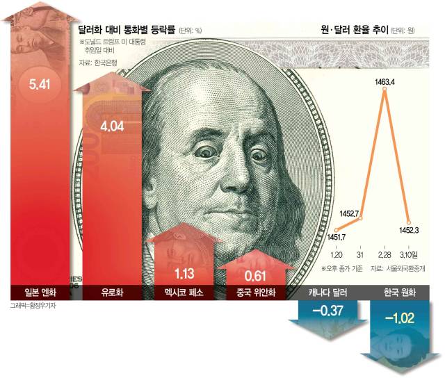 10일 한국은행 등에 따르면 트럼프 대통령이 취임한 1월 20일 이후 미 달러화 대비 원화 가치는 1% 넘게 절하됐다. 유로화(4.04%), 엔화(5.41%) 등 주요국 통화가 달러화 대비 절상한 것과 대조적이다.