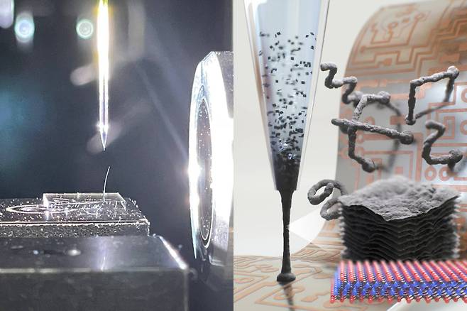 이 방식은 3D 프린터의 노즐에서 잉크가 분사될 때 맥신 나노 물질이 빠르게 결합해 전기가 통하는 3D 마이크로 구조물을 형성하는 원리로 작동한다.