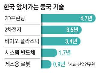 10일 매일경제가 산업연구원과 공동으로 국내 주력 산업과 유망 신산업의 경쟁력을 중국과 비교 분석한 결과 적층제조(3D프린팅) 부문은 한국의 경쟁력이 중국보다 4.7년 뒤처진 것으로 나타났다. 2차전지(3.5년)와 바이오 플라스틱(3.4년), 탄소섬유복합소재(3.1년) 등도 격차가 3년 이상 벌어졌다. 차세대 먹거리로 꼽고 있는 시스템 반도체의 한중 산업 격차는 1.7년이었고, 유전자 재조합 의약품(1.7년)과 세포치료제(1.5년) 등 의학·바이오 부문도 1년 이상 차이가 났다. 산업용 로봇 역시 중국이 한국보다 0.9년 앞서 있다.