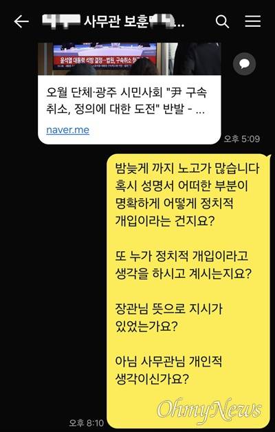 | ▲ 국가보훈부 서기관과 5·18민주유공자유족회 양재혁 회장이 지난 7일 오후 나눈 카카오톡 메시지. 오후 5시 9분 서기관이 이날 5월단체가 발표한 '윤석열 대통령 구속 취소 결정 비판' 성명 등을 담은 기사를 보내왔다. 오후 8시 10분엔 양 회장이 성명서 어떤 부분이 정치 개입이냐, 누가 정치 개입으로 판단하느냐, 장관님 뜻인가라고 묻는다. 해당 서기관은 보훈공법단체를 담당하는 부서의 서기관이지만, 양 회장 휴대전화에는 사무관으로 표기돼 있다. 카카오톡 문자메시지 교환 외에도 두 사람은 이날 오후 5시 55분과 8시 19분 등 최소 2차례 전화로 대화를 나눴다고 한다. |