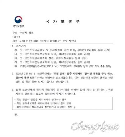 | ▲ 국가보훈부가 7일 밤 10시 5·18민주유공자 유족회 등 5월 3단체에 정치적 중립 의무 준수를 요구하는 내용을 담아 내려보낸 공문. 보훈부는 이날 법원의 윤석열 대통령 구속취소 결정을 비판하고 석방을 반대하는 5월단체 성명을 문제 삼았다. 2025. 3. 8 |