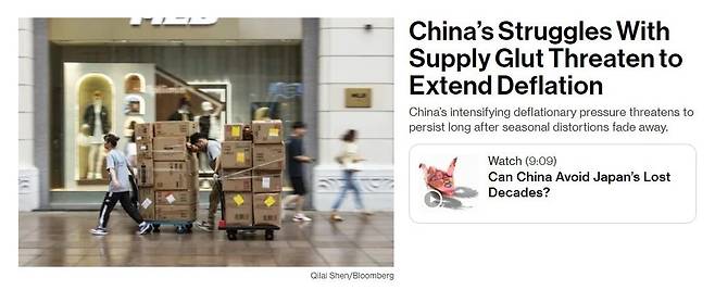 중국 경제가 '디플레이션'에 빠질 것이라는 공포가 커지고 있습니다. 블룸버그통신은 10일 중국 물가 하락 소식을 아시아판 인터넷 톱기사로 다뤘습니다. 옆에는 '중국이 일본의 잃어버린 수십년을 피해갈 수 있을까'라는 분석 영상도 같이 포함됐는데요. 중국의 디플레이션 위기, 얼마나 심각하길래 이렇게 중요하게 다뤘을까요.