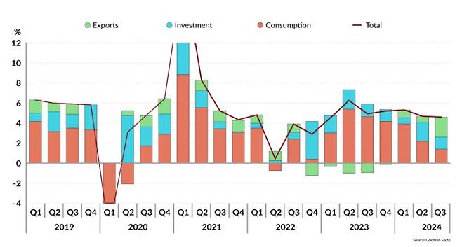 마지막으로 남은 것은 수출입니다. 아래 골드만삭스 자료에 따르면 2024년 1분기부터 중국 경제 성장에서 수출이 차지하는 비중이 급격히 증가했습니다. 이는 중국 내수가 부진하자 기업들이 '저가 밀어내기 수출'에 나선 결과로 풀이됩니다.