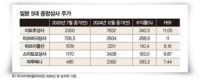 5대 종합상사의 주가는 버핏이 매수를 공개한 2020년 8월과 비교해 세 자릿수 이상 수익률을 기록했으나 주가수익비율(PER)은 지난해 말 순이익 기준 평균 9.5로 여전히 양호한 수준이다. 버핏이 언급한 이후 일학개미 역시 일본 종합상사 주식을 사들였다. 한국예탁결제원에 따르면 버크셔해서웨이의 연례 주주 서한이 공개된 후 일주일간(2월 24~28일) 국내 투자자는 일본 5대 종합상사 주식을 총 583만 달러(약 84억 원)어치 순매수했다. 일본 증시 전문가인 김채윤 NH투자증권 연구원은 "지금까지 자원주·고배당주를 선호해온 버핏의 투자 성향과 일본 종합상사가 잘 맞아떨어진 것"이라며 "최근 자원 가격이 하락하면서 단기간의 주가 상승 여지는 크지 않을 것으로 보인다"고 말했다. 이형오 교수는 "버크셔해서웨이의 투자 방식과 일본 종합상사의 투자 방식은 크게 차이가 나지 않는다"면서 "특정 분야에 리소스 대부분을 투입하는 일반 기업과 달리 앞으로도 안정적인 수익을 거둘 것으로 전망된다"고 말했다.