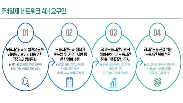 주 4일제 네트워크는 “장시간 노동 체제에서 벗어나기 위한 1차 과제는 경제협력개발기구(OECD) 평균 노동시간대 진입(장시간 한도 하향, 연차휴가 확대)이며, 2차 과제는 유럽연합(EU) 평균 노동시간대 진입(법정노동시간 단축 및 주 4일제 도입)”이라고 설명했습니다.