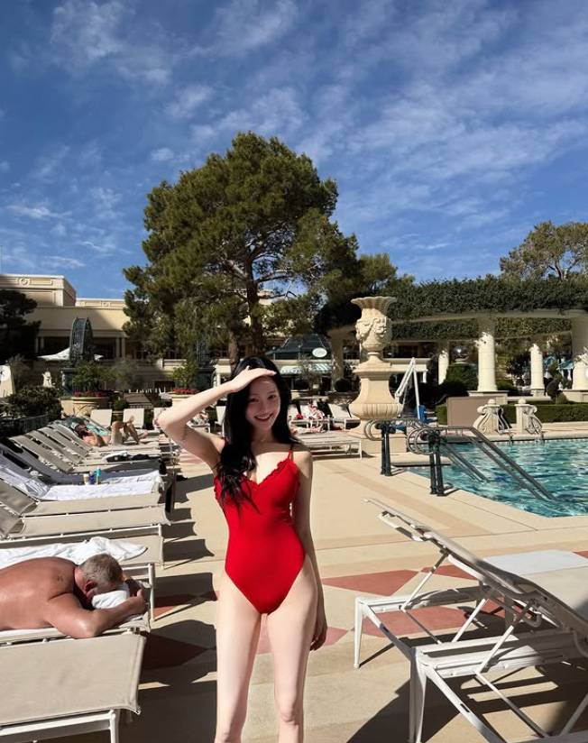 공개된 사진들 속 이유비는 미국 라스베이거스의 한 호텔 야외 수영장에서 빨간색 수영복을 입고 다양한 포즈를 취하고 있다.