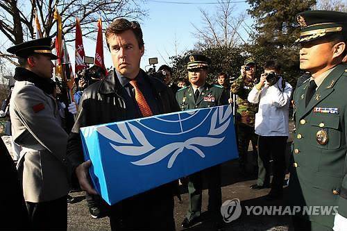 [국방부 유해발굴감식단이 충남 연기군 전동면 개미고개 일대에서 미군 전사자 유해 1구를 발굴해 2012년 2월 2일 오후 서울 동작구 국립현충원 내 유해발굴감식단에서 미국측에 인도하고 있다. 6ㆍ25전쟁 초기 미군의 전투현장이었던 곳에서 발굴된 이 유해는 미 JPAC의 중앙신원확인소로 옮겨져 DNA감식 등을 거쳐 신원 확인 후 유가족에게 인도된다. 왼쪽 두번째는 그레고리 버그 미 JPAC 선임감식관, 오른쪽은 유해발굴감식단 감식과장 김종성 중령. (사진=연합뉴스)]