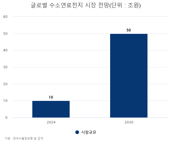 이때 해결책으로 등장한 것이 수소연료전지이다. 수소연료전지는 독립적인 에너지원으로 안정적인 전력 생산이 가능할 뿐만 아니라 탄소 배출량도 적다. 데이터센터 전원 공급이 끊겼을 때 수소연료전지가 비상 전원 역할을 할 수 있다. 글로벌 수소연료전지 시장은 데이터센터 구축 등으로 지난해 10조원에서 2030년 5배 증가한 50조원까지 성장할 것으로 업계는 분석하고 있다.