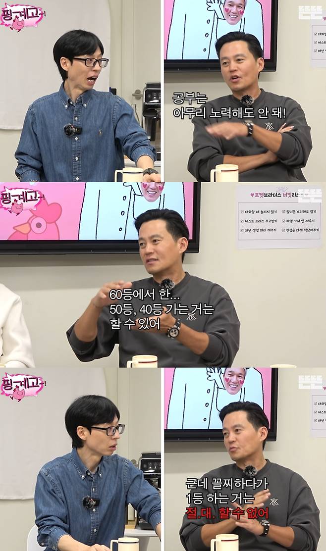 "노력해도 되는 경우 있지 않나"라는 유재석의 말에 이서진은 "60등에서 한 50등, 40등 가는 거는 할 수 있다. 꼴지하다 1등 가는 거는 절대 할 수 없다. 노력해도 안 된다. 머리가 따라오질 않는다. 타고난 게 없다. 공부도 타고 나야 한다"고 주장했다.