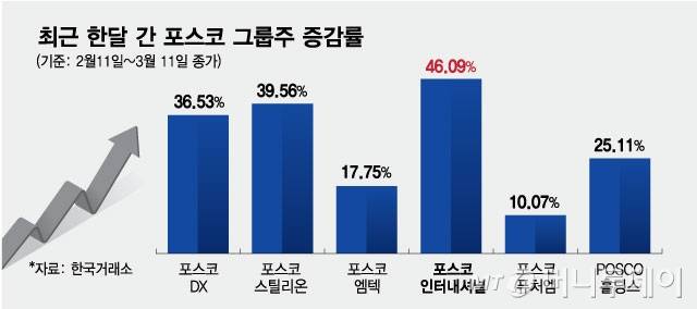 이날 한국거래소에 따르면 지난 한달 간(2월11일~3월11일) 포스코인터내셔널은 1만8550원(46.09%) 오르며 포스코그룹주에서 가장 높은 주가 상승률을 보였다. 같은 기간 포스코DX(36.53%), 포스코스틸리온(39.56%), 포스코퓨처엠(10.07%), POSCO홀딩스(25.11%) 등 포스코그룹주도 일제히 상승했다.