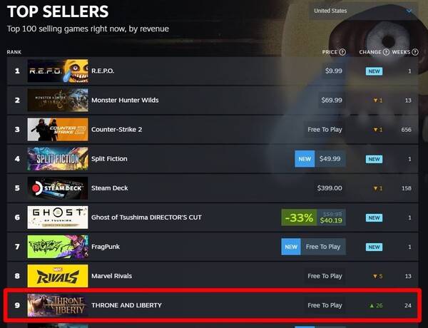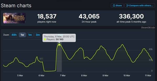 11일 스팀 통계 사이트 '스팀DB'에 따르면 TL은 지난 6일(현지 기준) 업데이트 직후 최고 동시 접속자 5만160명을 기록했다. 업데이트 이전보다 이용자 수치가 2배 가까이 상승하며 스팀 최고 판매 9위에 오르기도 했다.
