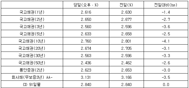 10년물 금리는 연 2.760%로 4.1bp 하락했다. 5년물과 2년물은 각각 2.5bp, 2.7bp 하락해 연 2.633%, 연 2.650%에 마감했다.