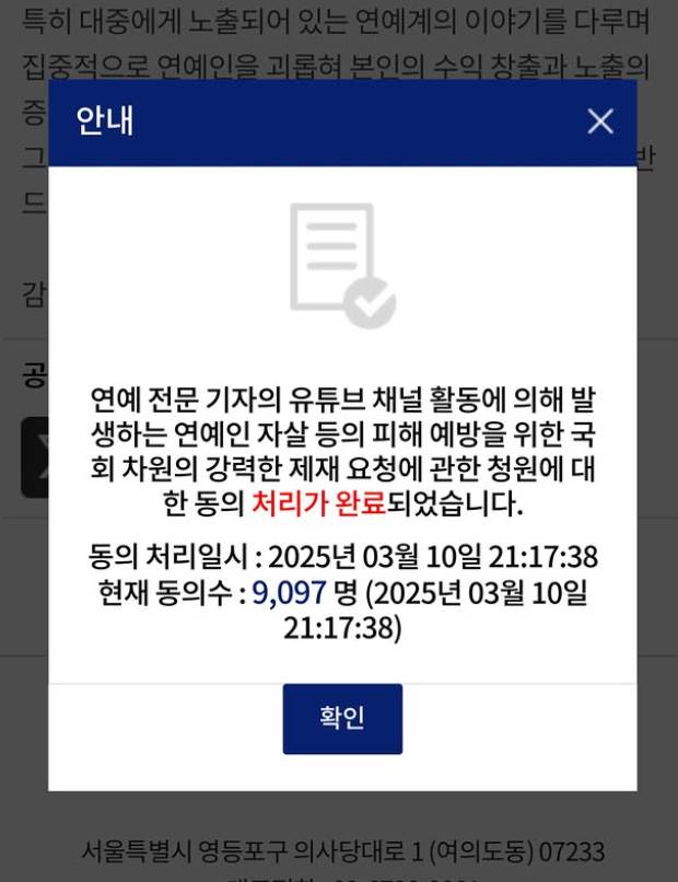 그는 '연예 전문 기자의 유튜브 채널 활동으로 발생하는 연예인 자살 등의 피해 예방을 위한 국회 차원의 강력한 제재 요청'이라는 제목의 청원에 동의하며 목소리를 냈다.