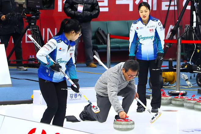 | ▲ 9일 열린 웰컴저축은행 강릉 인비테이셔널 국제컬링대회 결승전에서 김홍규 강릉시장(가운데)이 시구하는 가운데, 강릉시청 김선영(왼쪽), 김경애(오른쪽) 선수가 스위핑 준비에 들어가고 있다. |