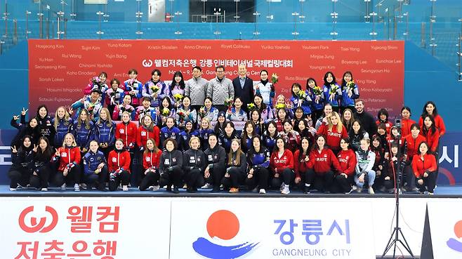 | ▲ 지난 9일 성공적으로 끝난 웰컴저축은행 강릉 인비테이셔널 국제컬링대회를 마친 후 참가자들이 기념 사진을 촬영하고 있다. |