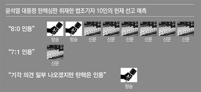 재판은 두 차례 변론준비기일을 빼고 모두 열한 번 열렸다. 현장 기자들은 52시간에 이르는 재판을 꼬박 지켜봤다. 기자협회보가 이들 중 10명에게 심판 결과를 어떻게 예측하는지 물었더니 그중 8명이 재판관 8대0 만장일치로 탄핵이 인용된다고 내다봤다. 1명은 7대1로 인용된다고 했고 남은 1명은 몇 대 몇일지까지는 알 수 없어도 기각 소수의견이 나올 거라고 봤다.