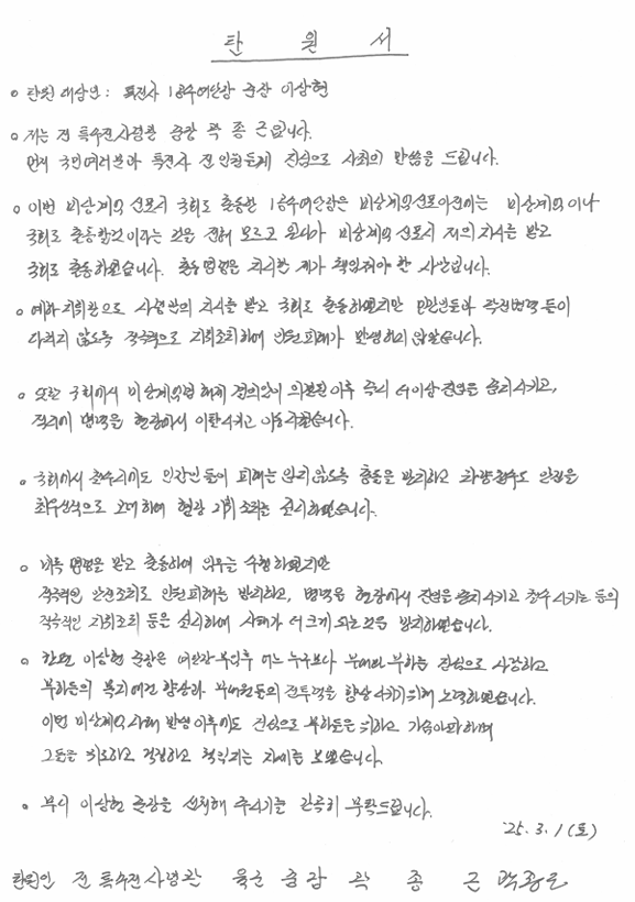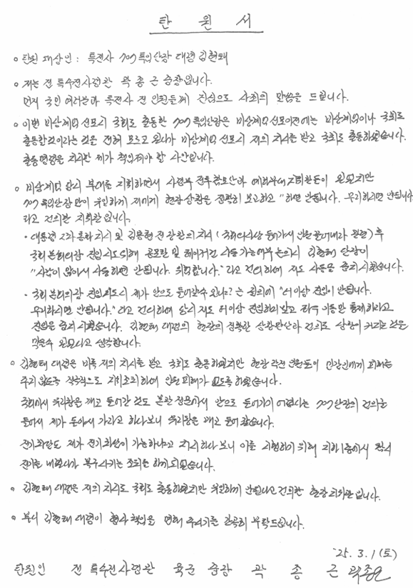 11일 법조계에 따르면 곽 전 사령관은 지난 1일 옥중에서 이상현 제1공수특전여단장(준장)과 김현태 제707특수임무단장(대령)의 선처를 호소하는 내용의 탄원서를 작성했다.