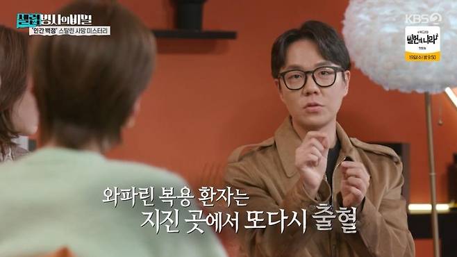 이낙준은 "주로 심방세동 환자에게 사용한다. 혈액이 응고되지 않게 묽게 해준다. 실제 와파린을 복용하는 사람들은 지혈이 안 된다. 제가 응급실에서 당직을 설때 코피 환자가 왔는데 와파린을 드시는 분들은 지진 곳에서 또 피가 나온다"라고 설명했다. 이어 독살설에 대해 "이론상은 가능하다"라고 했다.