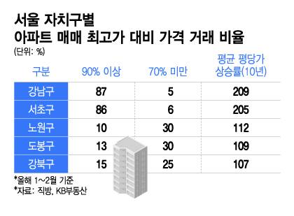 반면 노원구, 도봉구, 강북구 등 외곽 지역에서는 종전 최고가 대비 90% 이상 수준에서 거래된 비중이 각각 10%, 13%, 15%에 그쳤다. 특히 도봉구와 노원구의 경우, 올해 거래의 약 30%가 고점 대비 70% 미만 수준의 가격에 이뤄진 것으로 나타났다.