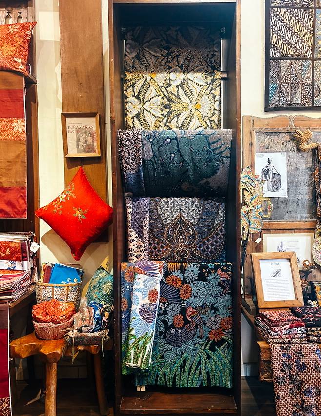 출장 일정 중 짧게나마 우붓 시내를 둘러볼 기회가 생겼고, 망설임 없이 미리 봐 두었던 '루시 바틱(Lucy's Batik)'으로 발걸음을 재촉했다. 루시 바틱은 바틱 아이템을 중심으로 다양한 인도네시아 전역의 수공예품과 예술품을 소개하는 가게다. 로컬 장인과 협업해 완성한 바틱 패턴을 활용해 패션부터 액세서리, 홈 패브릭 등 고유한 전통 예술을 보존하면서도 현대적인 감각을 더한 아이템을 만날 수 있다. 가게 안으로 들어서니 공간을 가득 채운 패턴의 향연에 아득해지는 기분마저 든다. 다 갖고 싶다. 가지고야 말겠다. 핑핑 눈 돌아가던 와중에 검은색 천에 금색 바틱 패턴이 돋보이는 사롱 하나를 건드려보자, 주인장이 미소를 머금고 말려 있던 사롱을 펼쳐 보인다.