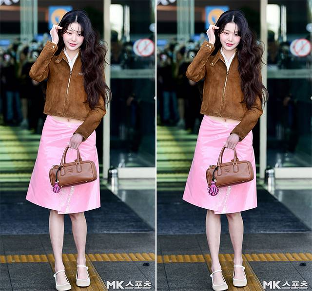 이날 출국길에서 장원영은 화이트 셔츠 위에 브라운 컬러의 스웨이드 재킷을, 그리고 눈길을 사로잡는 핫핑크 컬러의 스커트를 매치해 러블리한 패션으로 출국길에 올랐습니다.
