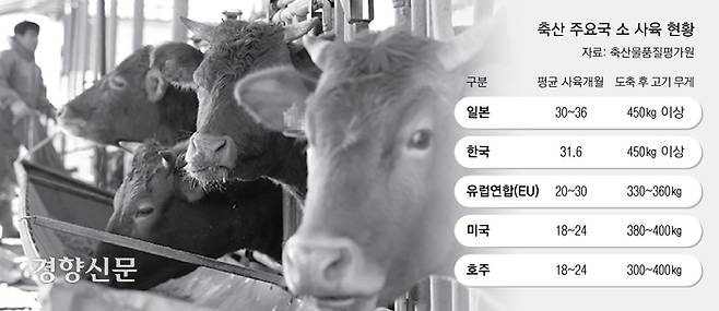 축산 주요국별로 평균 도체중량을 보면, 한국과 일본이 450㎏ 이상인 반면 평균 사육기간이 짧은 미국과 호주 등에선 300~400㎏ 정도다.