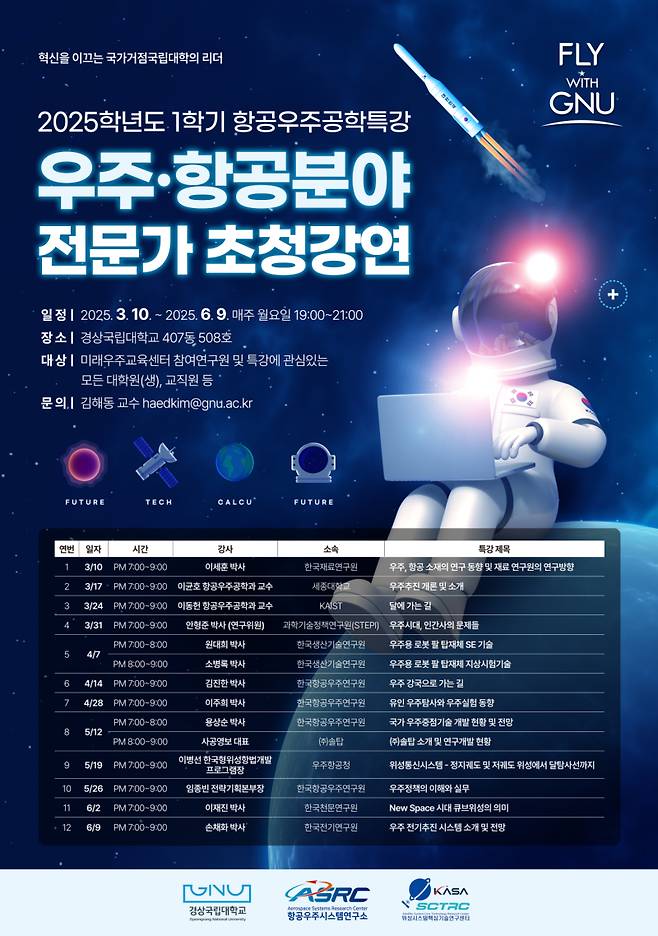 관심 있는 사람은 경상국립대 항공우주시스템연구소 누리집에서 자세한 일정과 강연 주제, 초청 강사를 확인할 수 있다.