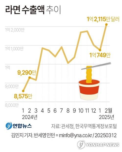 (서울=연합뉴스) 김민지 기자 = 12일 관세청과 한국무역통계정보포털(TRASS) 등에 따르면 지난달 라면 수출액은 1억2천115만3천달러로 잠정 집계돼 처음으로 1억2천만달러(1천749억원)를 넘으면서 월간 기준 '역대 최대'를 기록했다.