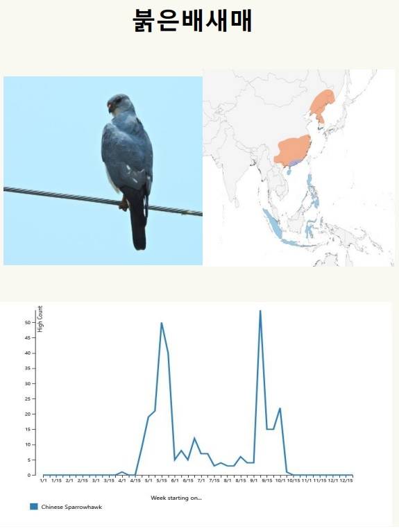 | ▲ 각 종마다 새의 이동은 연중 매우 다양한 분표를 보이는 예 붉은배새매는 4-5월, 9월에 집중적으로 한반도를 지나간다. 이 때 수천 개체까지 떼지어 지나가나, 다른 시기에는 거의 관찰되지 않는다. 따라서 이 시기의 조사가 누락되면 붉은배새매의 조류충돌 위험은 아예 빠지게 된다. 연중 조사가 필요한 이유이다. |
