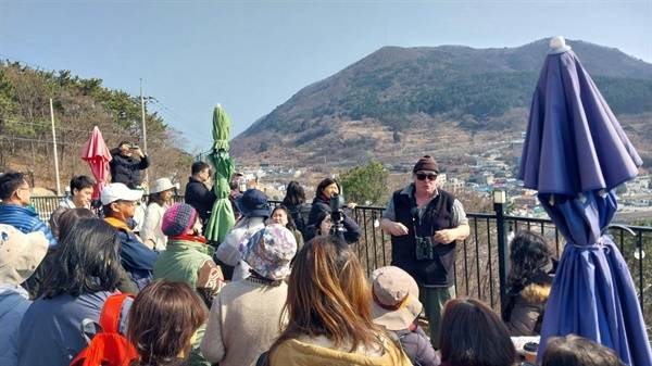 | ▲ 가덕도 국수봉이 보이는 위치에서 이루어진 조류충돌 현장 세미나 조류학자 나일무어스 박사가 시민들에게 조류충돌 위험을 설명하고 있다. |