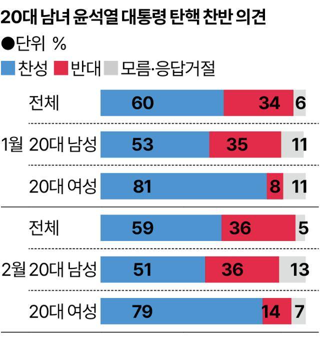 실제 서부지법 폭도가 이들을 대표해도 무방할 만큼 윤 대통령 탄핵을 결사 반대하지도 않는다. ②탄핵 찬성 비율이 전체보다 조금 낮을 뿐, 반대보다는 늘 앞섰다. 20대 남성의 경우 탄핵 찬성이 1월 53%, 2월 51%다. 반대(1월 35%, 2월 36%)를 크게 웃돈다. 30대 남성은 격차가 더 많다. 찬성 비율이 62%(1월), 55%(2월)다. 반대 목소리가 더 크게 들릴 뿐이다.