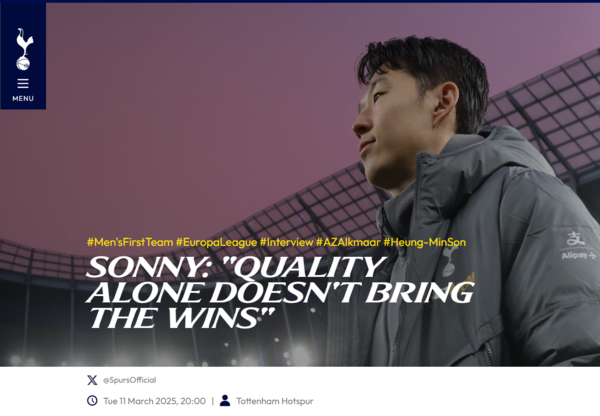 대망의 UEL 16강 2차전을 앞둔 상황, 토트넘은 구단 홈페이지를 통해 손흥민이 선수단에게 전하는 메시지를 공개했다. 손흥민은 구단 인터뷰에서 “단순히 개인 능력으로 승리할 수 없다. 경기는 항상 올바른 마음가짐을 가지고 집중해야 한다. 성과와 노력은 항상 중요하다”며 운을 띄웠다.