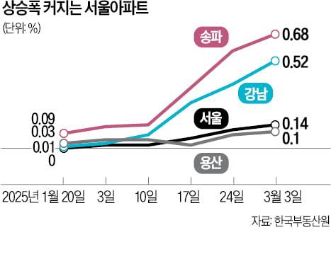 강남3구(강남·서초·송파구)가 서울 집값을 끌어올렸다. 강남구(0.38%→0.52%) 서초구(0.25%→0.49%) 송파구(0.58%→0.68%) 모두 상승세가 강해졌다. 송파구는 오름폭이 2018년 2월 첫째 주(0.76%) 후 7년1개월 만에 가장 컸다.