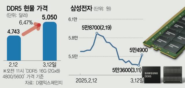 12일 시장조사 업체 D램익스체인지에 따르면 이날 기준 ‘DDR5 16G(2Gx8) 4800·5600’ 제품의 평균 현물 가격은 5.05달러로 한 달 만에 6.47% 증가했다. 현물가 상승 추세에 힘입어 지난달 말 기준 DDR5의 고정 가격(계약 가격)도 3.80달러를 기록하며 10개월 만에 반등에 성공했다. 전 세계 D램 시장에서 삼성전자와 SK하이닉스가 차지하는 비중이 압도적으로 높은 만큼 DDR5의 가격 반등은 두 기업의 실적 개선으로 이어질 가능성이 높다.