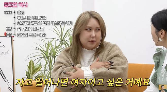 이날 그는 "나는 축구보다 공기놀이를 좋아하는 아이였다. 그땐 스스로 유니크하다고 생각을 했고, 중2가 돼서야 나는 남자를 좋아하지만 내가 남자인 상태로 남자를 좋아하는 게 아니라는 걸 깨달았다. 자고 일어나면 여자이고 싶었다. 그때 '난 여자가 돼야겠다'란 생각을 했다"라고 털어놨다.