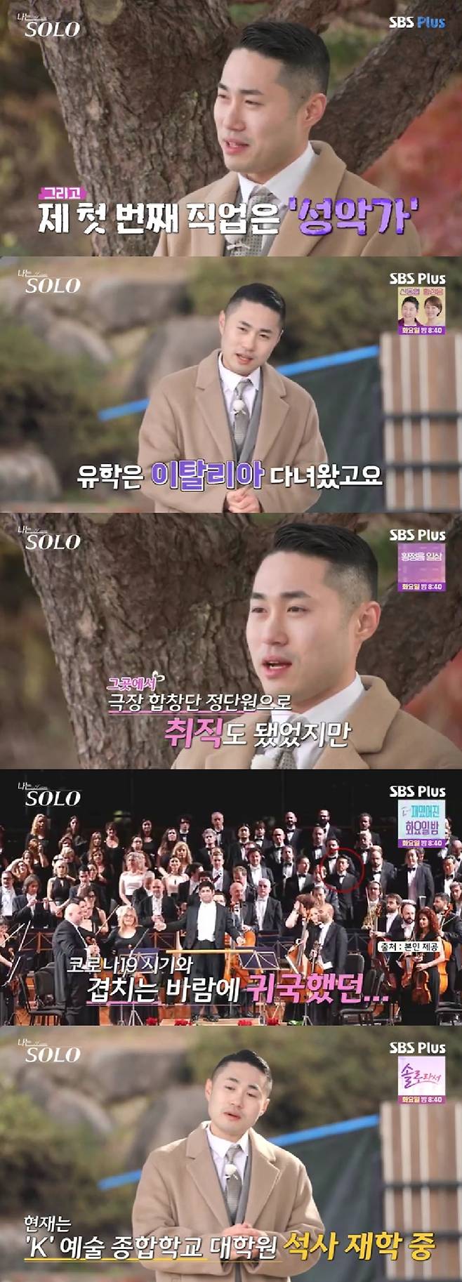 그는 "첫 번째 직업은 성악가다. 한국예술종합학교 나왔고, 유학은 이탈리아 다녀왔다. 극장 합창단 정단원 취직까지 돼서 쭉 다녔다"며 경력을 설명했다.