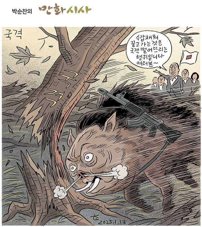 “수갑 채워 끌고 가는 것은 국격 떨어뜨리는 행위입니다. 여러분~.” 국민의힘 깃발 아래 정치인들이 이런 말을 할 때, 윤석열 대통령의 얼굴을 한 멧돼지는 ‘국격’이라고 씌어진 나무를 향해 돌진해 나무를 송두리째 부숴버린다.