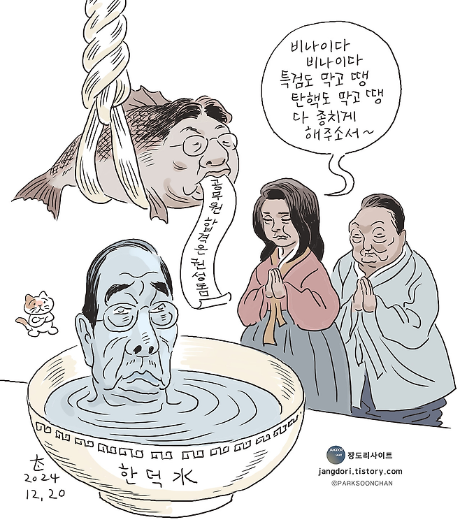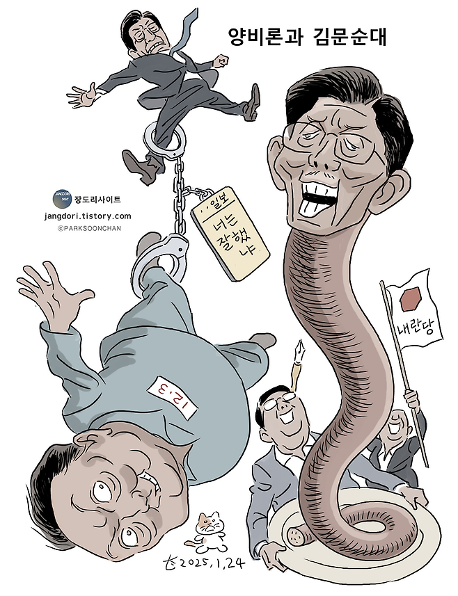 비상계엄 선포를 예견한 듯한 만평에서는 섬뜩한 느낌이 들기도 한다. 지난해 8월20일 작품인 ‘반국가 세력과의 전쟁’ 만평에서 윤 대통령은 군복을 입은 채 탄띠를 두르고 주먹을 앞세우며 “반국가세력과의 전쟁이다”를 외치고 있다(171쪽). 반국가세력 운운하던 당시 8·15 경축사와 그 무렵의 발언들은 돌이켜보니 계엄 선포를 위한 ‘빌드업’ 과정이었다. 30년 경력의 시사만화 작가는 그 발언에서 곧바로 ‘군 사령관 윤석열’을 떠올렸으리라. 이를 현실세계에서 구현하려던 대통령은 이제 헌법재판소의 탄핵심판을 코앞에 두고 있다.
