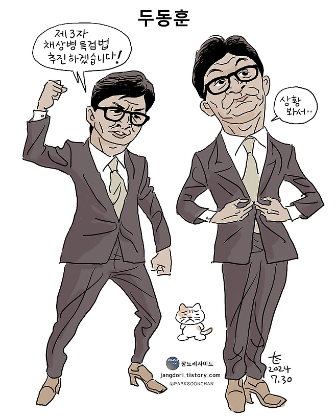 등장인물은 주로 여권 정치인이다. 권성동 국민의힘 원내대표는 몸통이 물고기로 자주 그려진다. “공무원 시험 합격은 OOO”을 외치는 ‘권성돔’이라는 캐릭터로 자주 그려진다. 보수진영 차기 대선후보로 오르내리는 김문수 고용노동부 장관은 몸통이 순대다. 경기지사 재임 당시 119에 전화를 걸어 관등성명을 요구한 ‘김문순대’ 사건이 배경이다. 한동훈 전 국민의힘 대표의 턱은 항상 위로 치켜세워져 있고 셀카를 찍기 위해 팔 근육 단련까지 한다. 안철수 국민의힘 의원은 항상 입을 삐쭉 내민 가방 맨 초등학생으로 표현되고, 이준석 개혁신당 의원의 얼굴엔 여드름 자국이 빠지지 않는다.