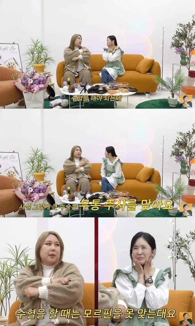 풍자는 "보통 9시간에서 10시간 정도 걸리는데 피가 너무 많이 나와서 14시간 만에 나왔다"며 "그렇게 큰 수술은 보통 무통주사를 맞는데, 나는 단 한 통도 맞지 못했다"고 털어놨다.