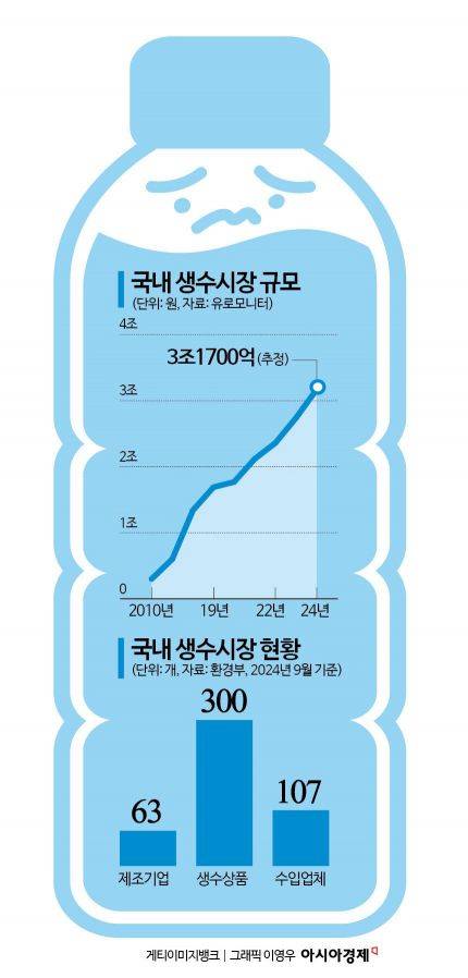 이후 생수시장은 매년 빠르게 성장했다. 글로벌 시장조사기관 유로모니터에 따르면 2010년만 생수시장 규모는 약 3000억원대까지 올라섰다. 2018년에는 처음 1조원을 돌파했고, 예상보다 2년 빠른 2021년에 2조원의 벽을 깼다. 2023년 기준 국내 생수시장은 크기는 2조7400억원에 달하는데 지난해에 3조원을 넘어섰을 거라는 게 유로모니터의 전망이다.