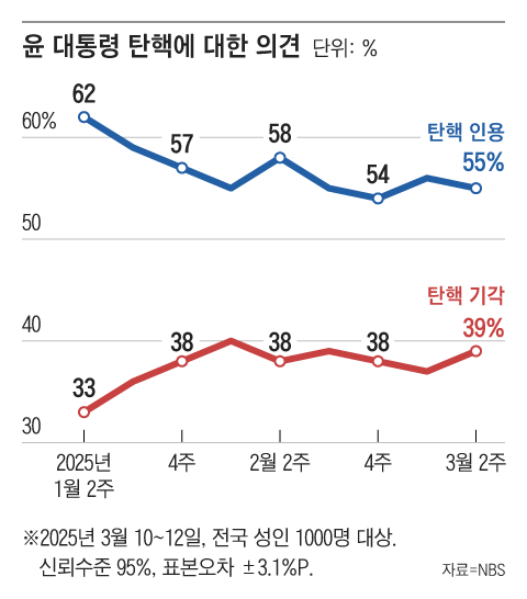 엠브레인퍼블릭·케이스탯리서치·코리아리서치·한국리서치 등 여론조사 업체 4사가 지난 10~12일 성인 남녀 1000명을 대상으로 실시한 전국지표조사(NBS)에 따르면 ‘탄핵을 인용해 파면해야 한다’는 응답자의 비율이 55%로 ‘탄핵을 기각해 직무에 복귀시켜야 한다(39%)’는 의견보다 16%p 앞선 것으로 나타났다. 모름·무응답은 6%였다.