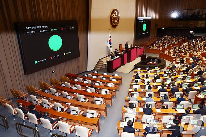 (서울=뉴스1) 김민지 기자 = 13일 오후 서울 여의도 국회 본회의장에서 열린 제423회 국회(임시회) 제1차 본회의에서 기후위기 특별위원회 구성의 건이 가결되고 있다. 2025.3.13/뉴스1