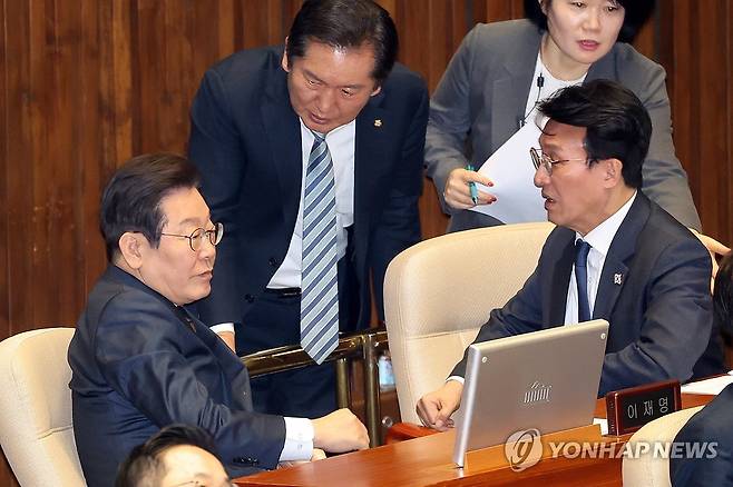 (서울=연합뉴스) 김주성 기자 = 더불어민주당 이재명 대표가 13일 국회 본회의에서 국회 탄핵소추위원장인 정청래 의원과 대화하고 있다. 2025.3.13