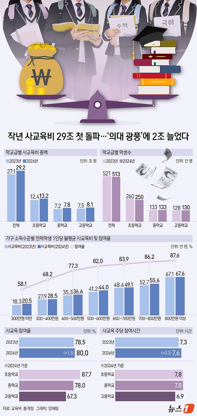 (서울=뉴스1) 양혜림 디자이너 = 지난해 우리나라 사교육비 총액이 29조 2000억 원으로 학생 수 감소에도 7.7% 늘면서 역대 최고치를 갈아치웠다. 사교육 참여율도 80%에 달해 역대 가장 높았다. 학생 1인당 월평균 사교육비는 47만 4000원으로 전년 대비 10%포인트(p) 가까이 증가했다.
