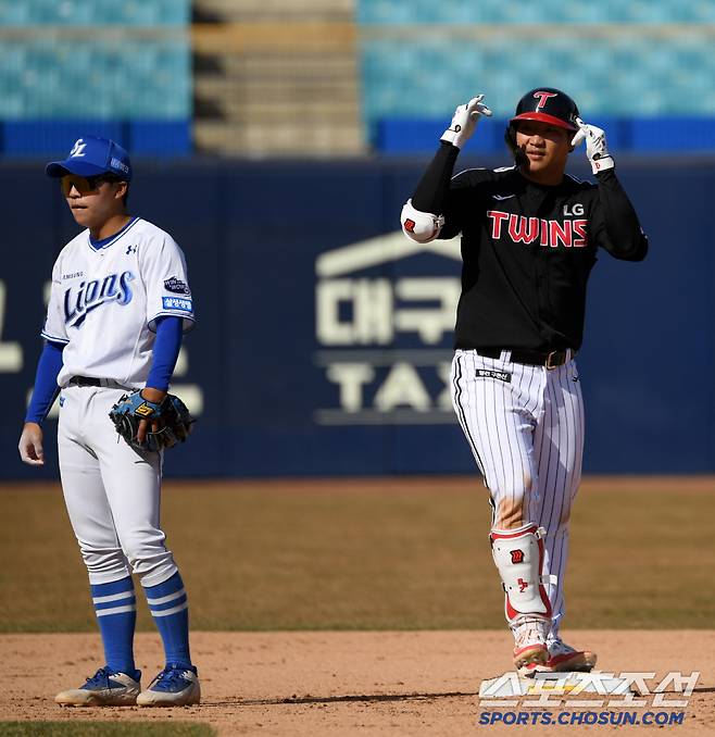 13일 대구 삼성라이온즈파크에서 열린 삼성 라이온즈와 LG 트윈스의 시범경기. 7회초 1사 1,2루 LG 문보경이 적시타를 날린 뒤 환호하고 있다. 대구=박재만 기자 pjm@sportschosun.com/2025.03.13/